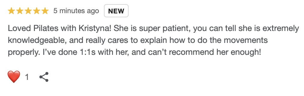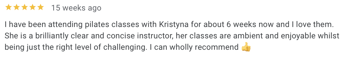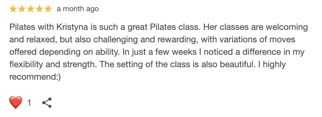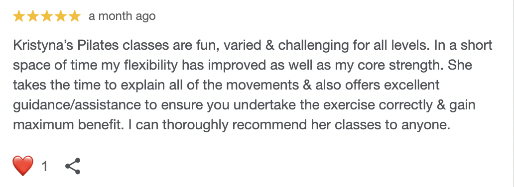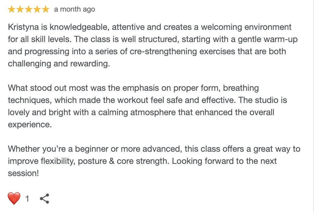Through my classes, YouTube channel In Motion with Kristyna, and in-person teaching, my mission is simple: to help you discover your strength, challenge yourself, and feel joy in movement. One of my favourite parts of class is the ending, seeing everyone leave the studio with smiles and happiness! Whether you’re looking to build core stability, improve posture, or simply take time for yourself, you’ll always find a welcoming space in my classes.