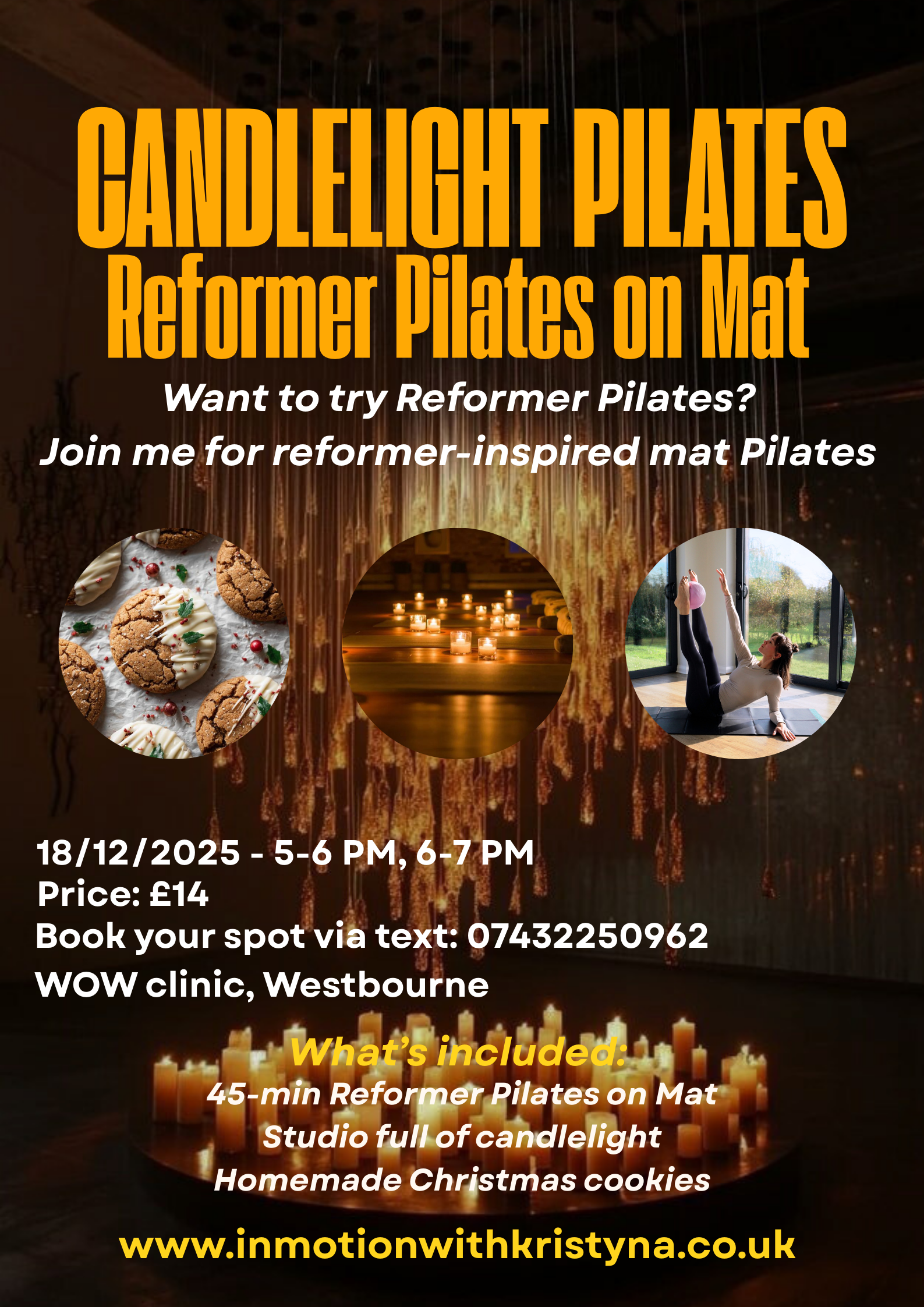 Candlelight Pilates evening! Glow, stretch & strengthen by candlelight, then enjoy homemade Christmas cookies & festive vibes